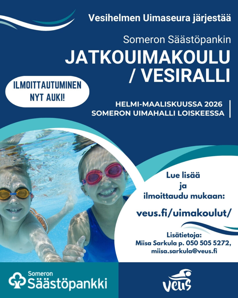 Helmi-maaliskuussa järjestämme Someron Säästöpankin Jatkouimakoulun/Vesirallin Someron uimahalli Loiskeessa. Uimakoulu järjestetään isossa altaassa, joten lähtötasovaatimuksena on 10 metrin uimataito sekä vatsallaan että selällään. Uimakoulussa kasvatetaan uintikestävyyttä, leikitään ja harjoitellaan erilaisia vesitaitoja kuten hyppyjä, sukelluksia ja kelluntoja ryhmän taso ja toiveita huomioiden. Uimakoulu järjestetään, mikäli osallistujia on vähintään 10. Ilmoittautuminen on nyt auki! Lisätietoja ja ilmoittautumislomake löytyy Uimakoulut-sivulta.